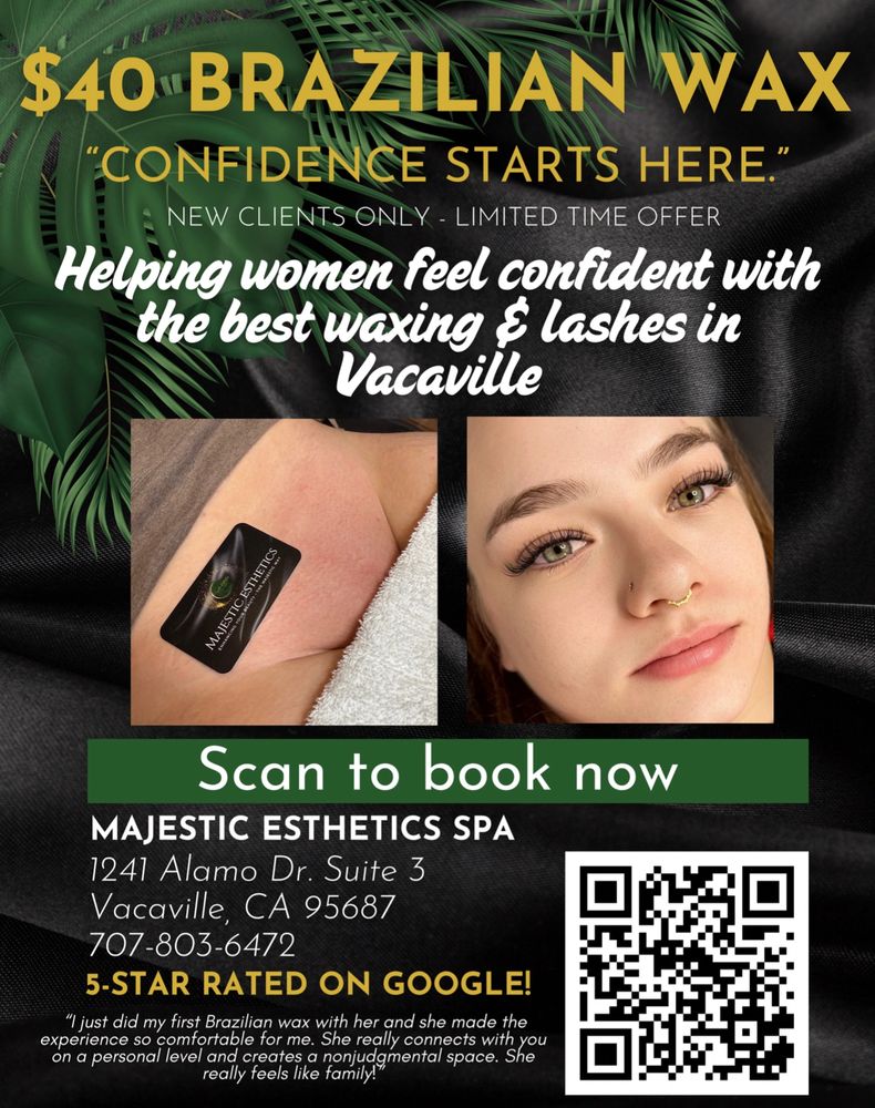 At Majestic home to Vacaville, every detail is intentional. We don’t just offer lash extensions waxing — we offer an experience that nourishes your energy and enhances your natural beauty. Whether you’re here for a quick brazilian wax or a full self-care ritual, you’ll be treated with soul, skill, and sacred attention. Your comfort, confidence, and glow are always our top priority.